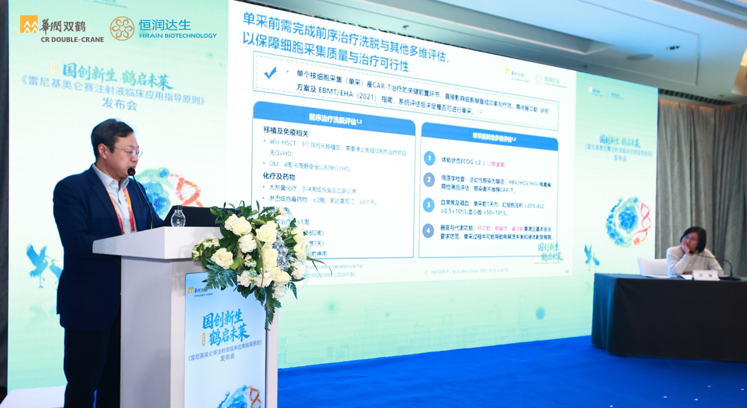 在白鸥教授的主持下,指导原则发布会正式启幕,主席团专家马军教授、朱军教授、吴德沛教授、沈志祥教授分别发表了热情洋溢的开场致辞,共同见证这一里程碑时刻。随后,复旦大学附属中山医院血液科主任刘澎教授系统介绍了雷尼基奥仑赛的研发历程与核心临床数据。