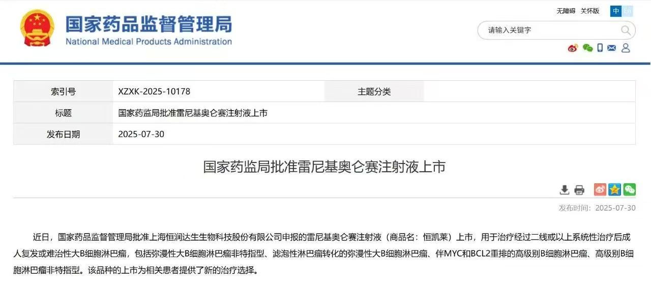 2025年7月30日,国家药品监督管理局正式批准上海恒润达生生物科技股份有限公司(以下简称“恒润达生”)申报的1类创新型生物制品-雷尼基奥仑赛注射液(商品名:恒凯莱®,英文商品名:HICARA®)的新药上市申请,作为我国首款完全自主研发的针对复发或难治性大B细胞淋巴瘤(r/r LBCL)的 CD19 CAR-T 产品,其获批不仅填补了国产 CAR-T 在该领域的空白,更标志着中国免疫细胞治疗技术迈入自主可控的全新阶段,为更多亟待满足的临床需求提供了解决方案。
